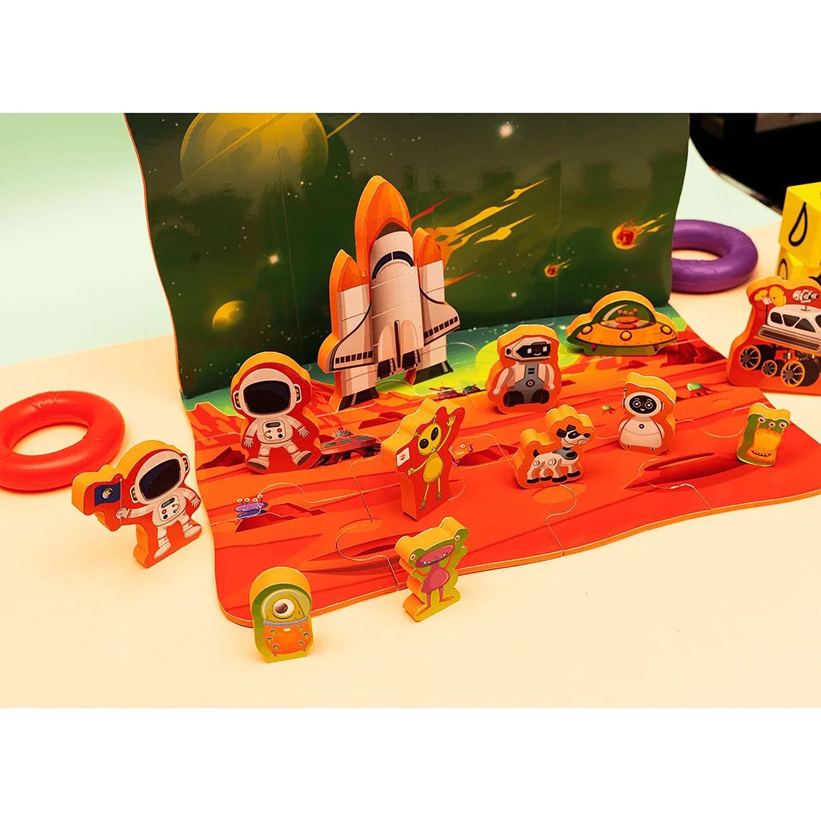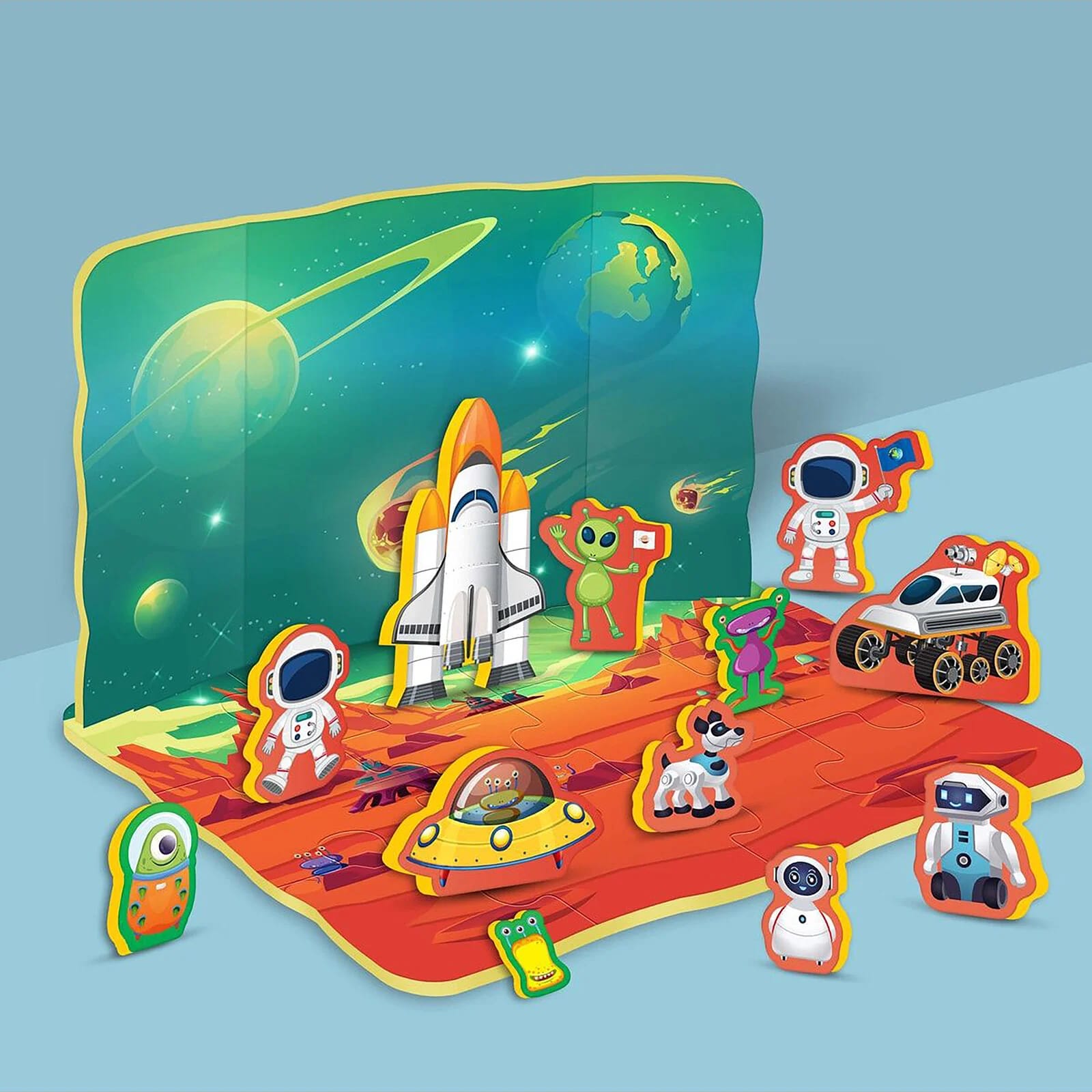 Includes 1 Background, 12 piece double sided puzzle and 12 standing objects.