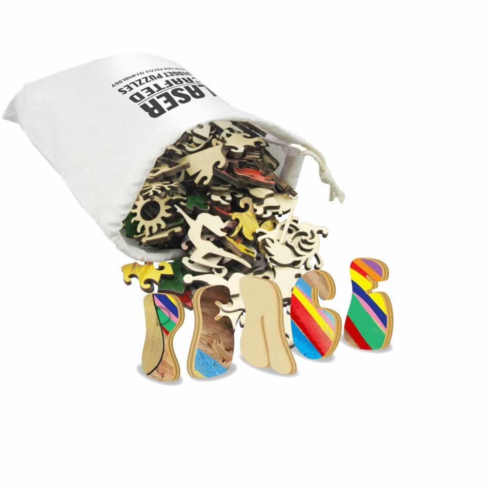 These unique and intricately crafted wooden puzzle pieces are laser cut to ensure smooth edges that fit perfectly together and every piece is different. The unique themed widget elements add a fun twist to building this puzzle. Extra thick wooden pieces ensure longevity for repeated handling. A material tote bag is included for easy storage of your puzzle pieces.