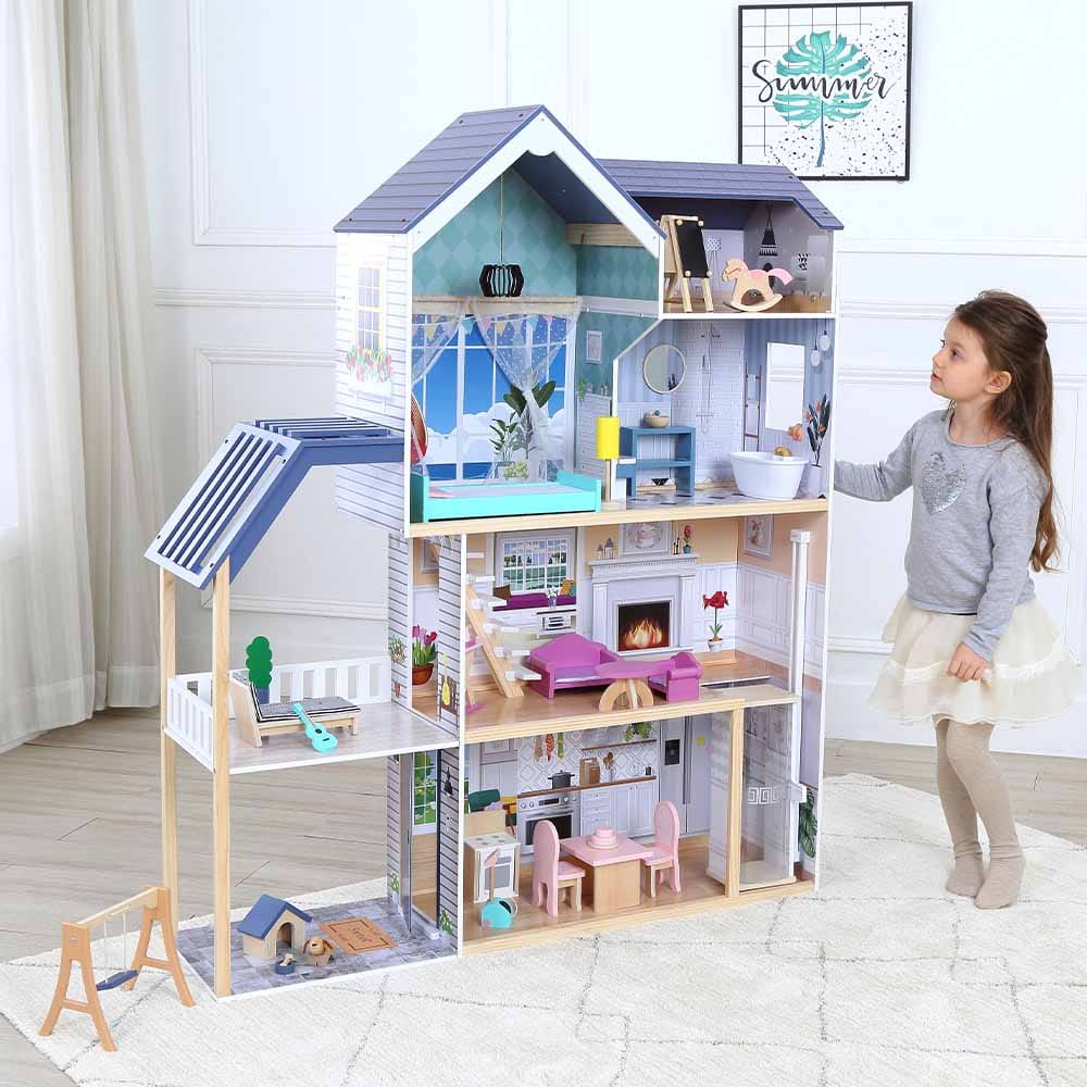 This modern doll house offers great play value in that it is not only life size, it comes with furniture and accessories, and features a real working lift as well as stairs to take you to the third floor. What’s more? The Nora Mansion Doll House has 4 rooms spread over 3 floors, as well as a loft above the bathroom.