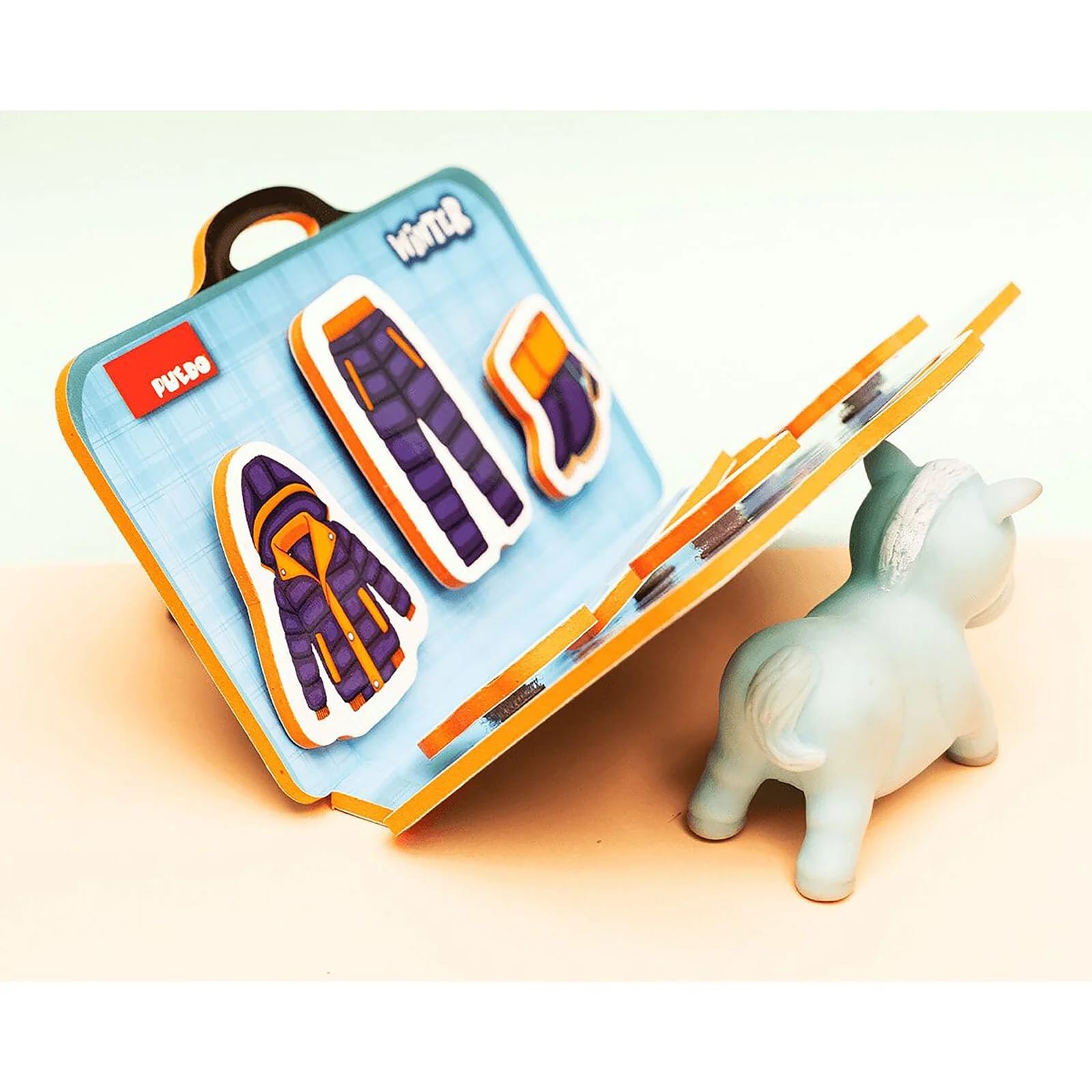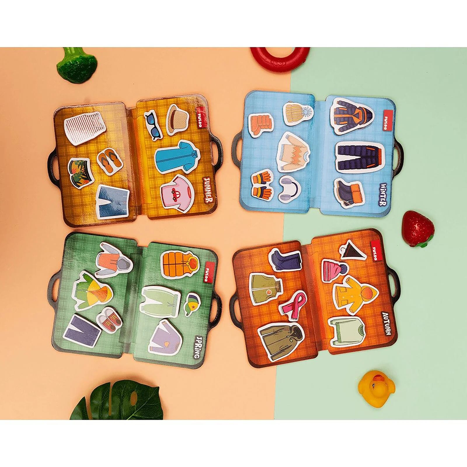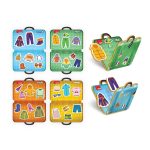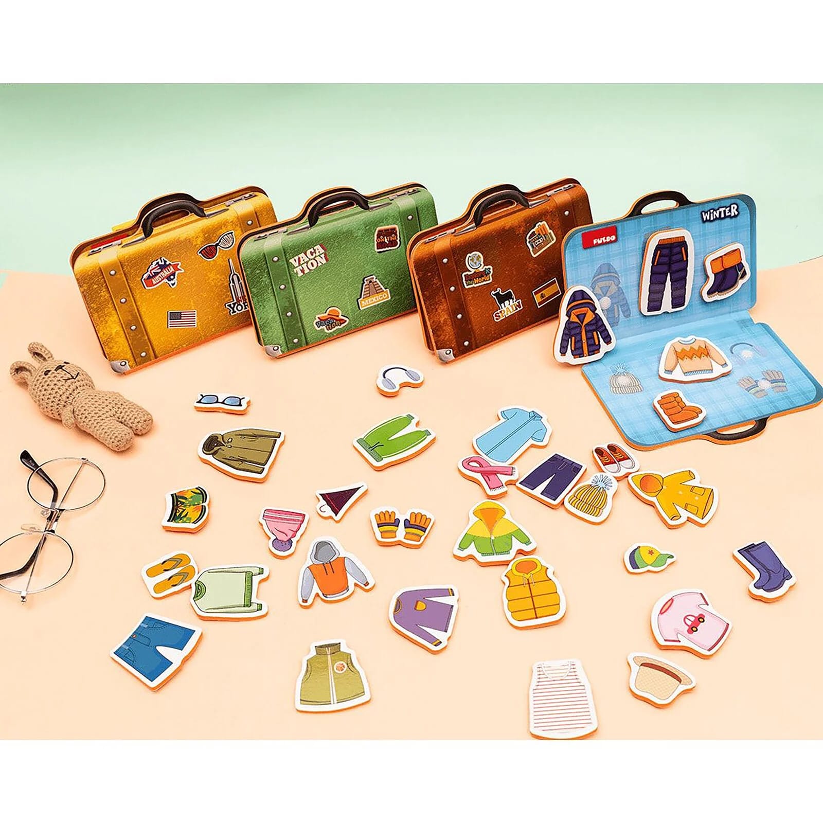 Includes 4 suitcases and 32 pieces of foam clothing pieces. Clothing stick to suitcase with Velcro.