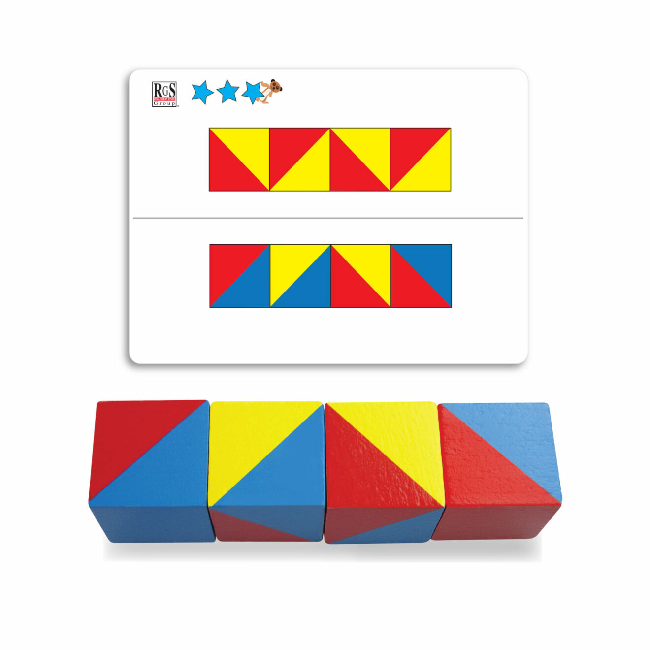 Includes 4 wooden cubes and 60 graded activities on laminated cards.
