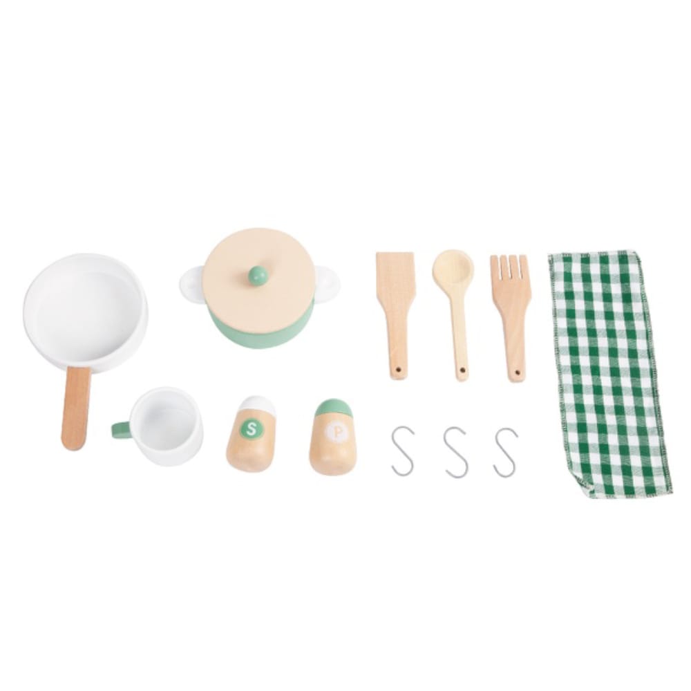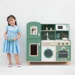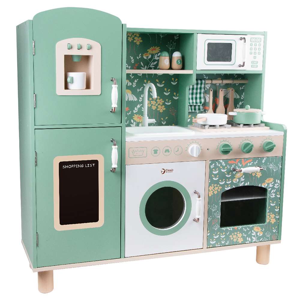 This wooden play kitchen is predominantly green with lovely floral patterns resulting in a classical retro style for children to enjoy. The set includes many functional areas such as sink, stove, cupboards and dishwasher plus more. Children can write down the ingredients they need to get prepared, or simulate the action of cooking on the stove, gaining an amazing cooking experience.