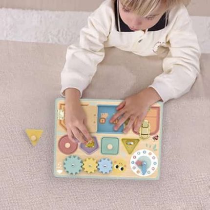 This beautifully crafted Busy Board from TookyToy has everything young children love to explore and discover as they undo latches and laces to open doors and hatches!